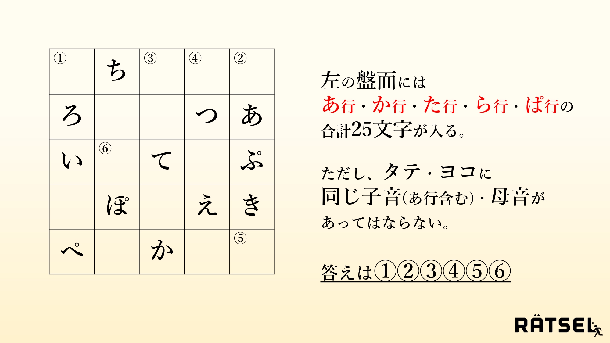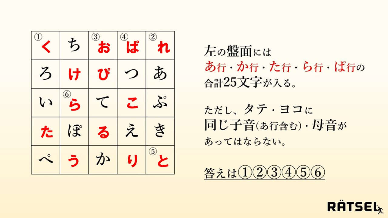 そのルールに従えば「?」にあてはまるのは「な」。従って謎の答えは『「お」と「な」』となります。